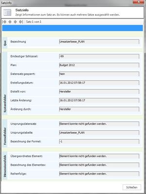 Dieser Dialog zeigt Ihnen Informationen zu einem oder mehrerern Datensätzen an. Aufgerufen wird dieser Dialog über das Kontextmenü der Zeilenköpfe in der Zeilensicht.
